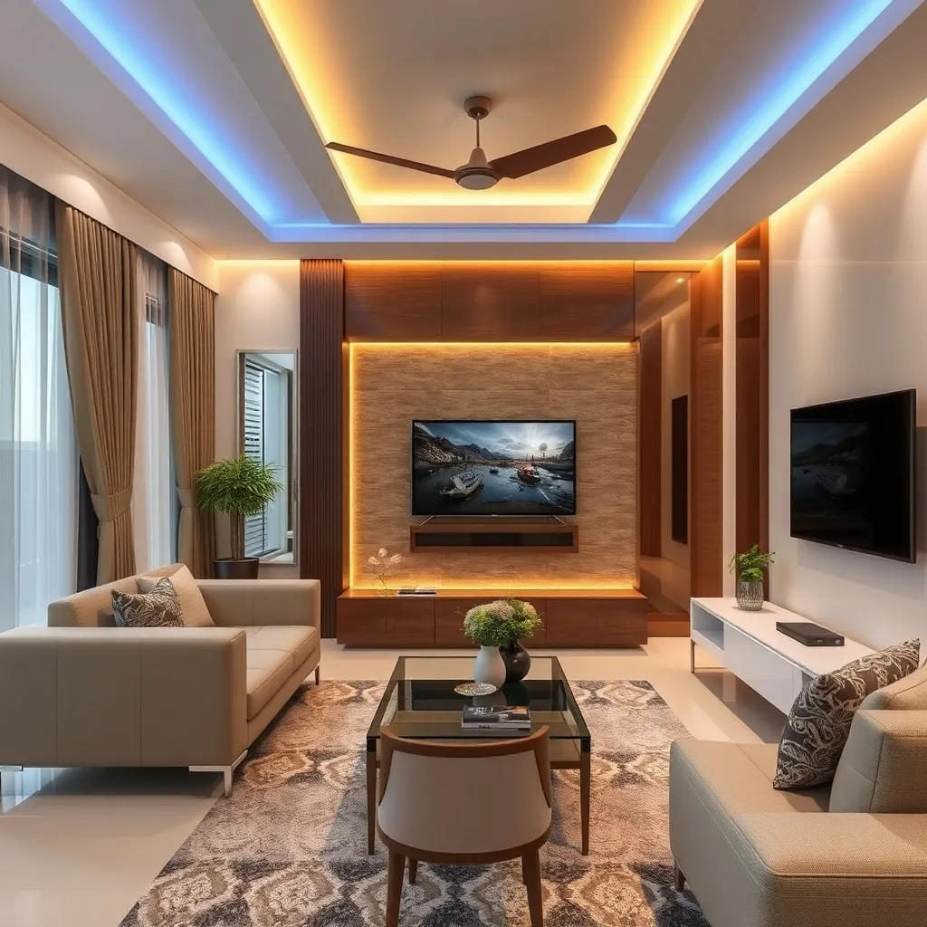 Modern TV feature walls, POP/gypsum ceilings, smart mood lighting and premium paint/polish to transform living and dining spaces in Greater Noida.