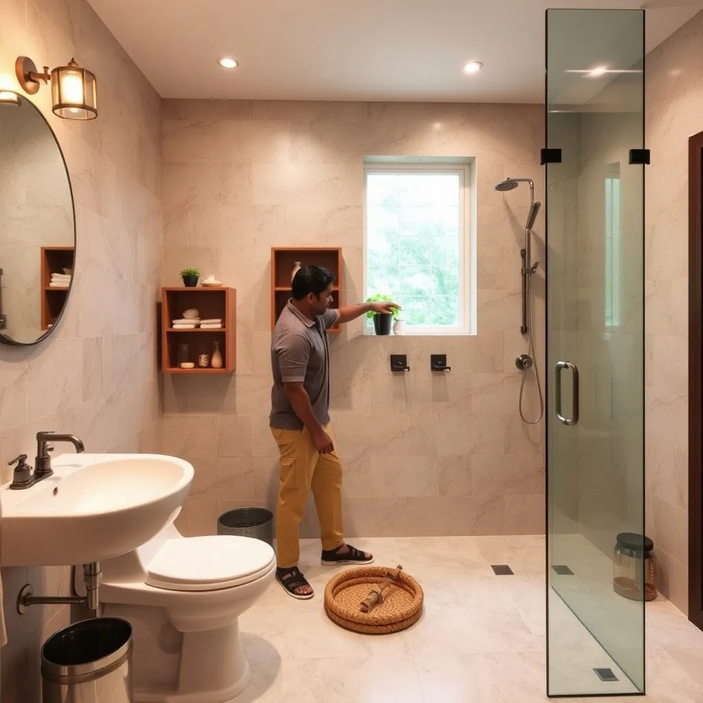 Leak-proof bathroom remodeling with 7-layer waterproofing, premium tiles and CP fittings, glass partitions, exhaust and geyser setup for Greater Noida homes.